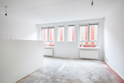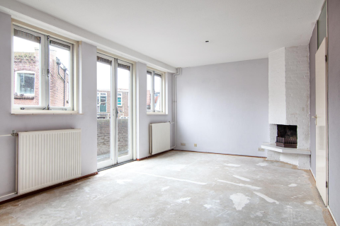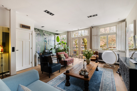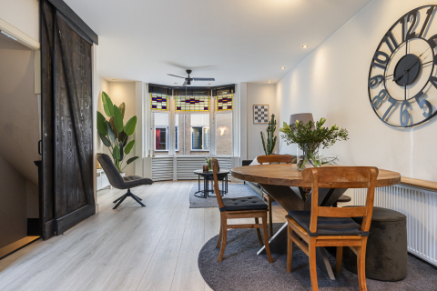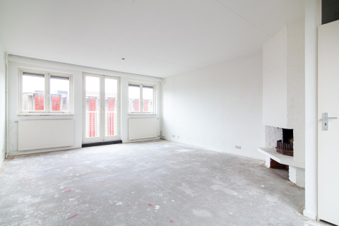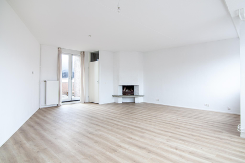 1e verdieping: entree, hal met toilet en fontein, cv-ruimte. Ruime, lichte woonkamer met mooie hoge ramen en een trap met 3 treden die toegang biedt tot het dakterras. Luxe open keuken (wit kunststof) met L-vormig aanrechtblad, rvs spoelbak, gaskookplaat, afzuigkap, oven, koelkast en vaatwasser. De grote badkamer is geheel licht betegeld en voorzien van een douchecabine, ligbad, wastafel en wasmachine-aansluiting. Tussenslaapkamer met raam in zijgevel. Grote slaapkamer aan de achterzijde over de volle breedte van de woning.